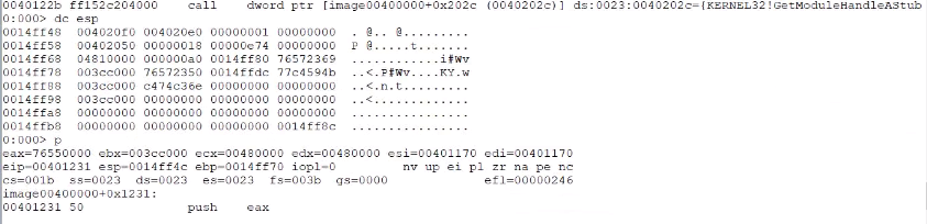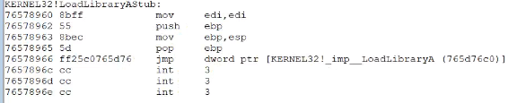 함수를 실행하고 반환값 eax 주소를 보면 loadlibrary 임을 확인가능하다.