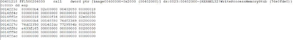 7. 다음 호출된 함수는 WriteProcessMemory 이고 특정프로세스에 값을 쓰는 행위를 한다.