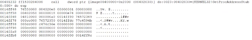 1번째 인자는 kernel32의 핸들값, 2번째 인자는 문자열인데 loadlibrary의 주소이다.