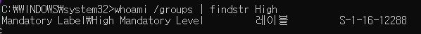 cmd창을 권리자권한으로 열고 권한을 확인해보면 high권한인것을 확인가능.